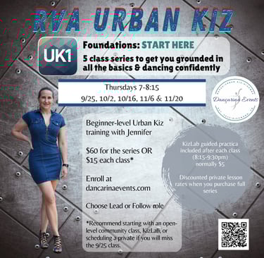 Foundations for beginners is a 75-min class series taught by Jennifer (this class replaces the previous Level 1 & Level 2). The Q4 2025 series will be on Thursday evenings starting Sept 25, on sale now. Available as a series, or individual drop-in classes. Each class includes admission for KizLab following class. Foundations Syllabus (if you are taking drop-in classes and will miss Class 1, schedule a private or attend a KizLab or open-level community class first to get grounded in rules and framework of the dance):